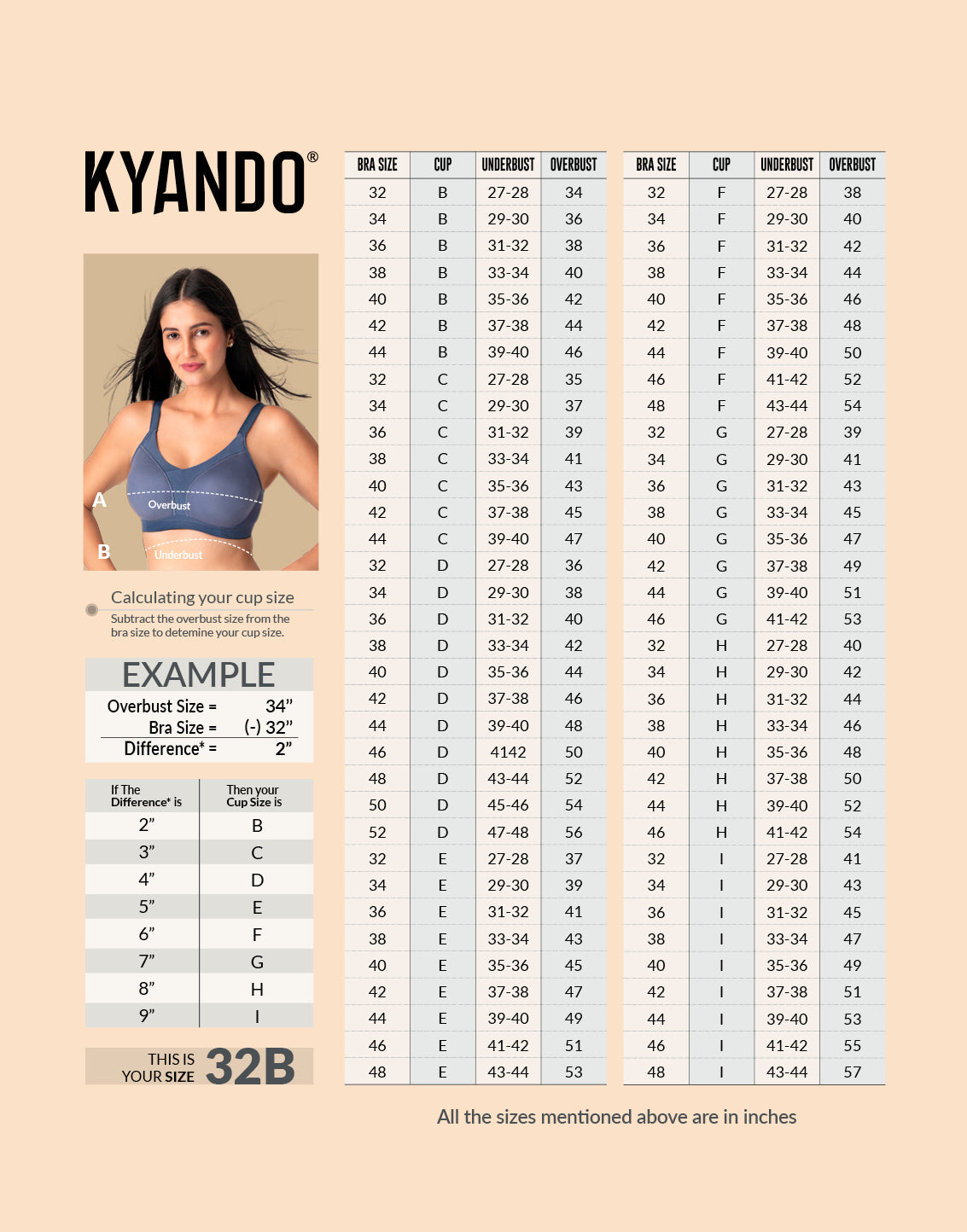 Use Kyando’s bra size calculator or size chart to measure your band and cup size accurately before purchasing your next bra for heavy breasts or any other style online.